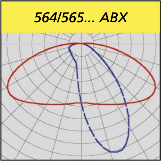 Répartition lumineuse : Faisceau asymétrique extrêmement large (ABX) ou faisceau circulaire (R).